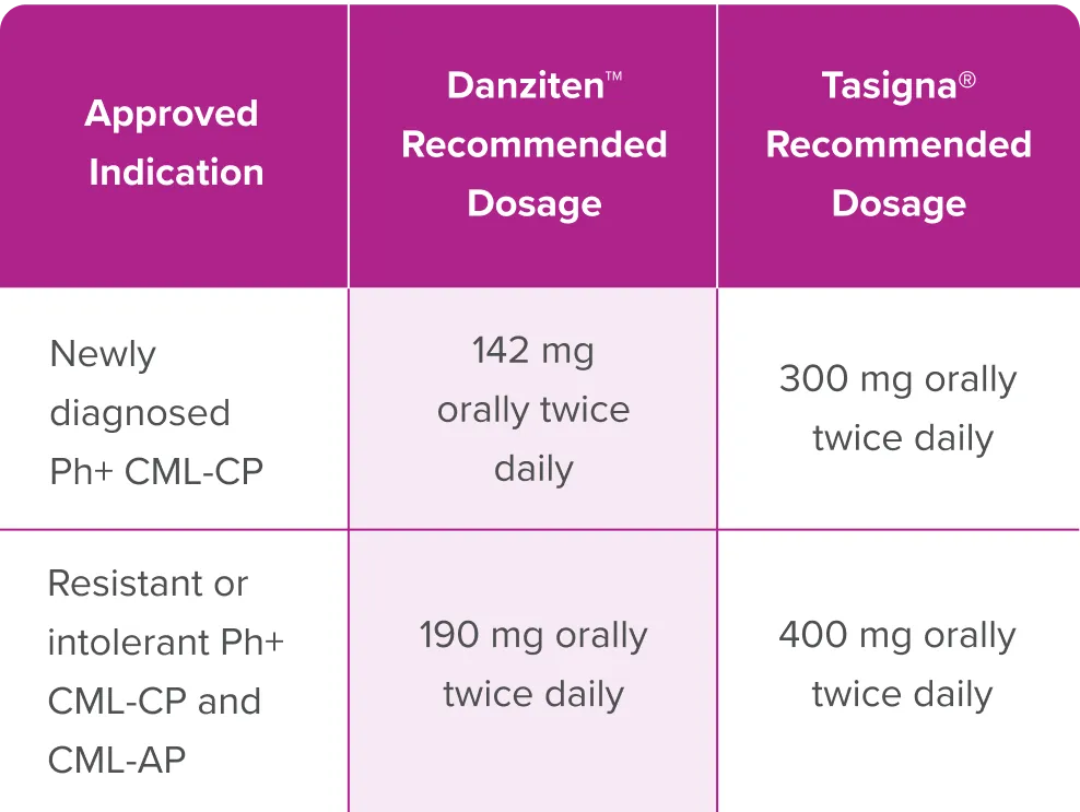 Danziten may not be substitutable with other nilotinib products on a milligram per milligram basis; to avoid medication errors, including overdosage or underdosage, when using Danziten ensure that the recommended dosage of Danziten (not other nilotinib products) is prescribed.